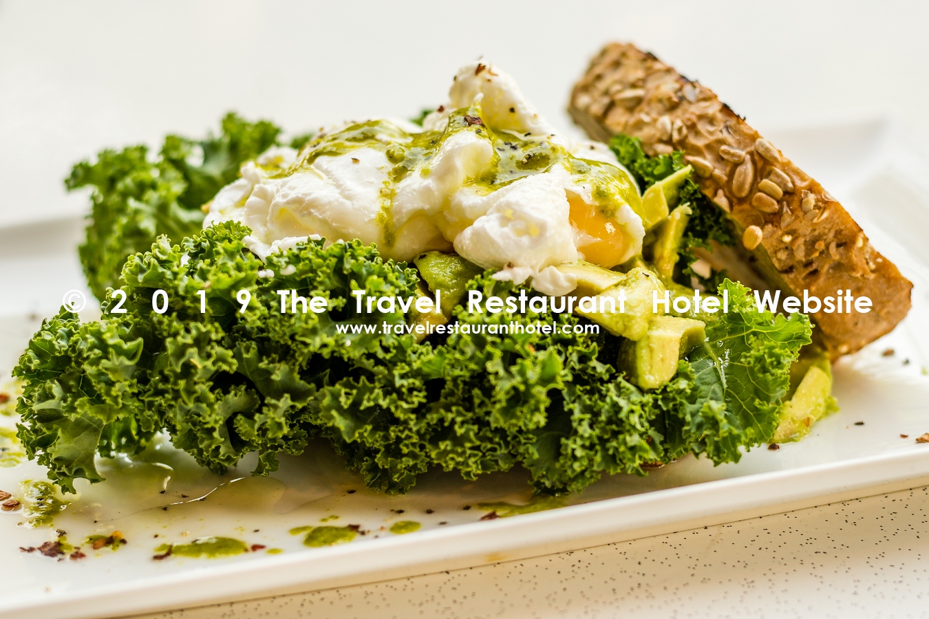Crushed avocado, lemon, olive oil, two poached eggs and fresh kale on wholemeal sourdough, with kale and basil pesto.