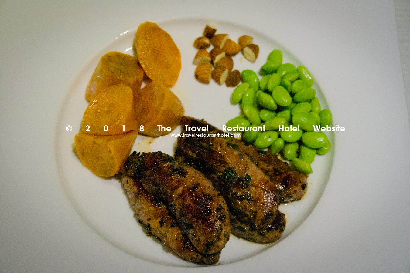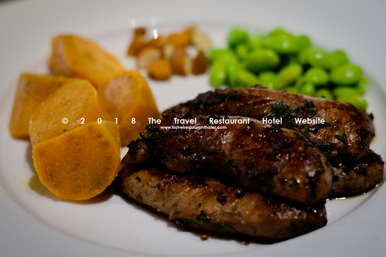 Thịt gà phi lê với sốt hương thảo đỏ với khoai lang, đậu nành non và hạnh nhân.