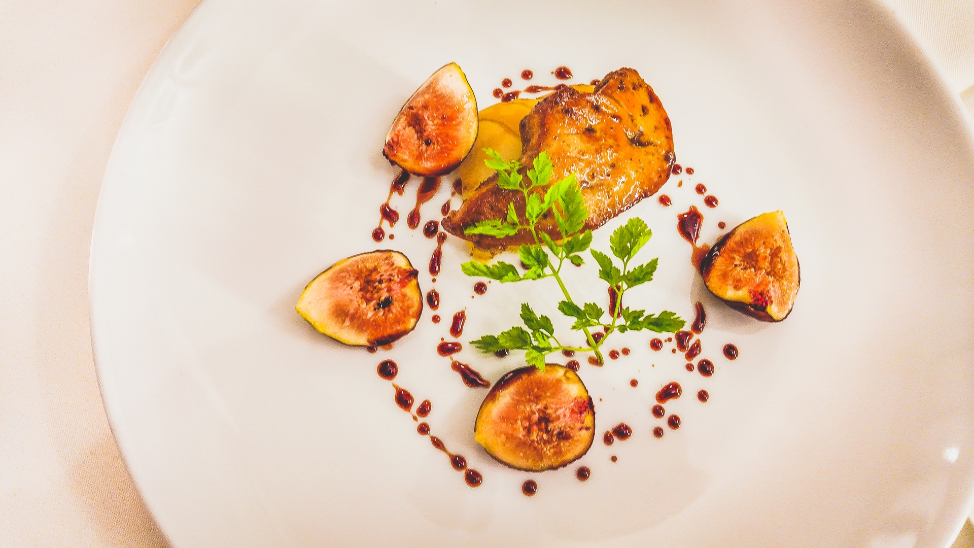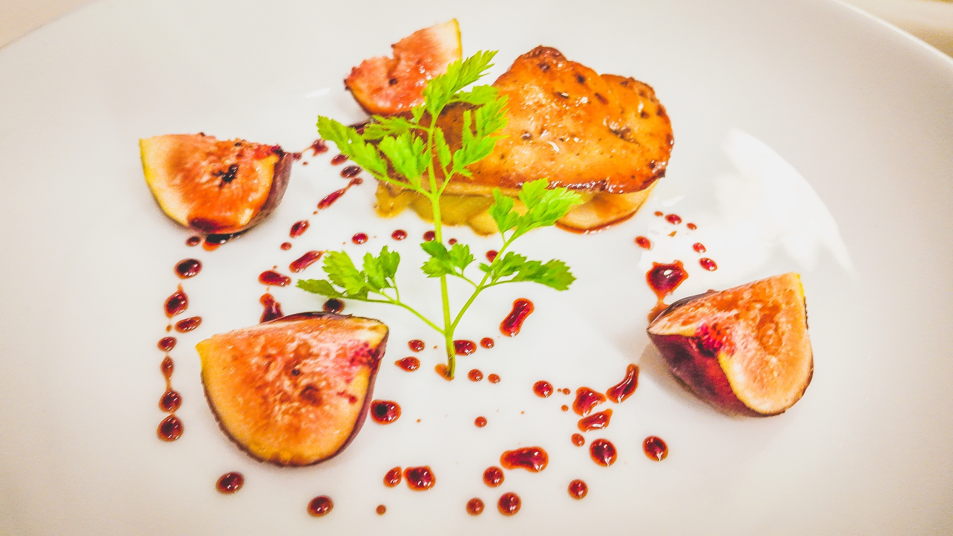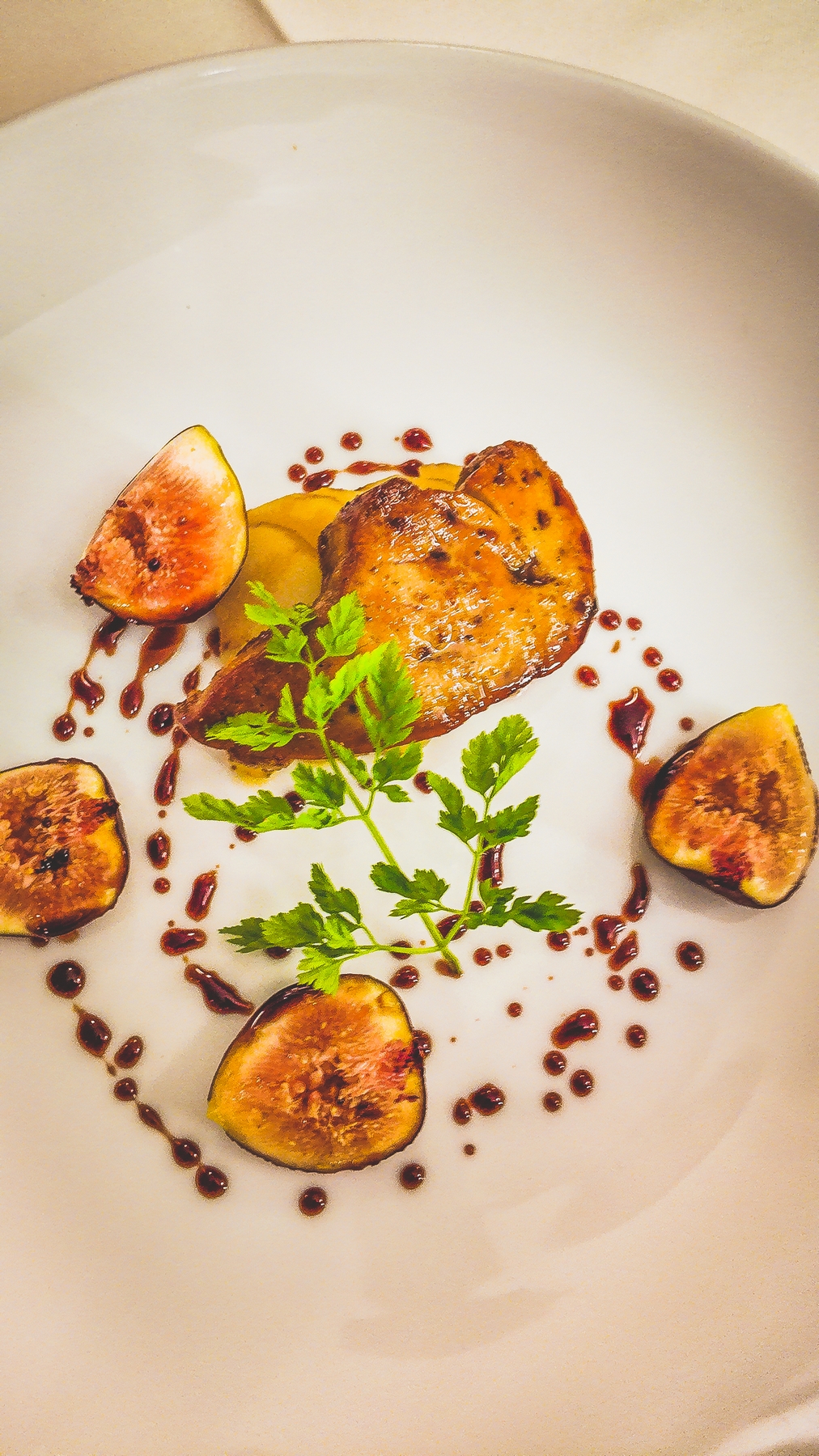 Pan-fried foie gras with glazed pears, fresh figs, balsamic glaze (IGP Modena)
