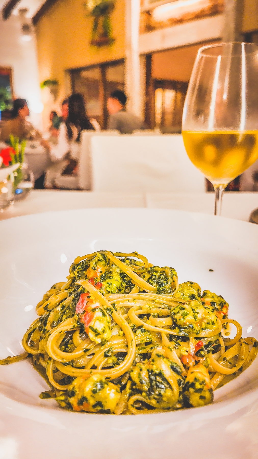 Medium-bodied with fresh citrus and floral notes, this white wine brings an exuberant brightness to the dish. The Pecorino grapes lend yellow hues with green reflections, while the bouquet of white-pulped and exotic fruits lifts the pesto, creating a harmony of freshness and depth that mirrors the dish itself.