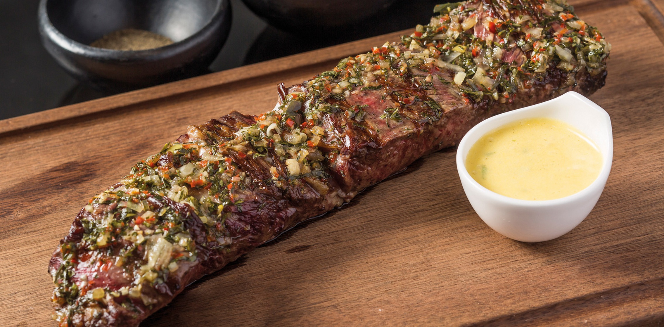 从阿根廷低地潘帕斯空运过来,这个有80年传统的阿根廷食谱呈现出的是一盘经过时间的考研的丰盛牛排板。它带着轻微的大蒜和柠檬玉米油味,撒上莫尔登海盐,并经过一次的明火烧烤后呈现出来。