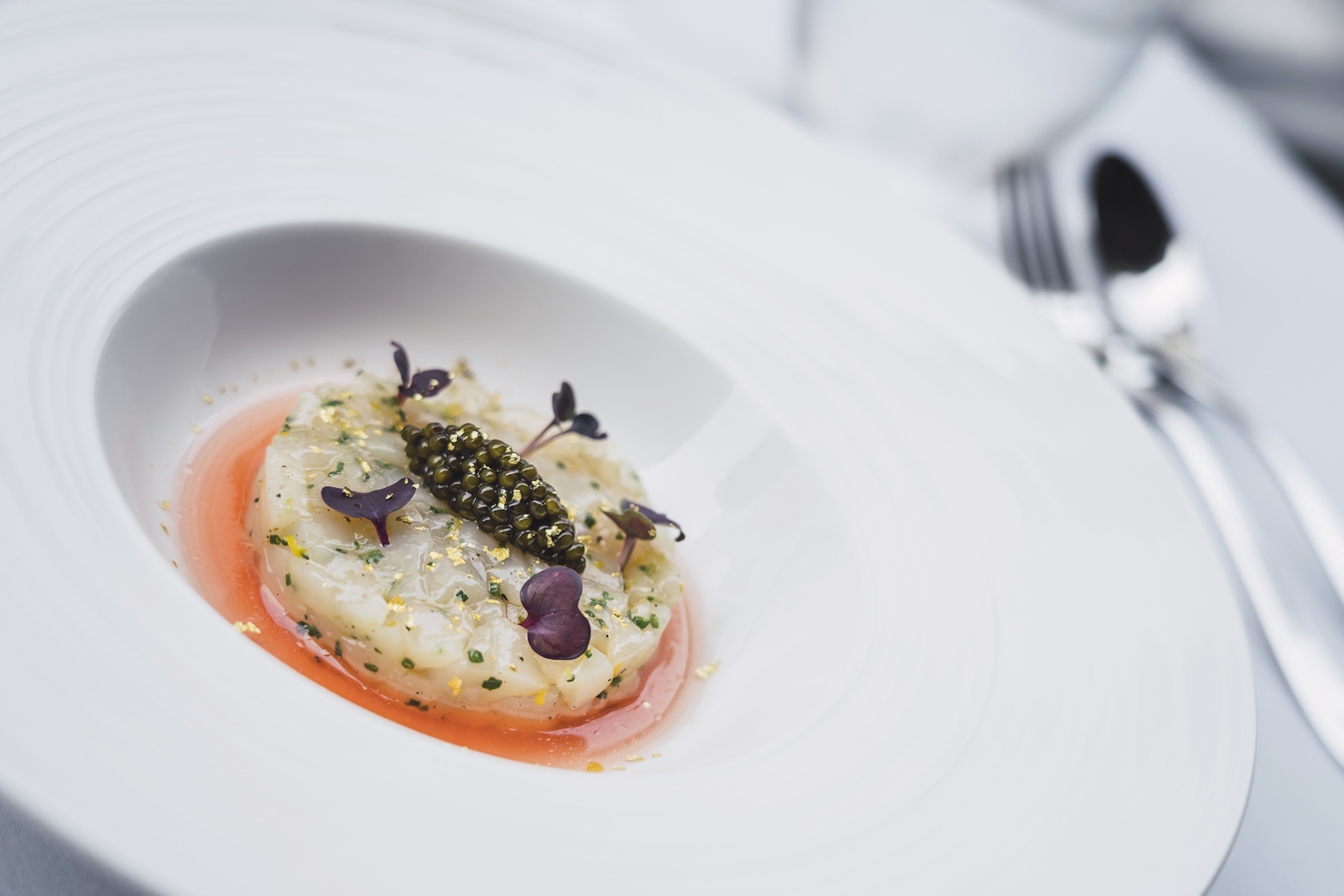 Hokkaido scallops “tartare”, Oscetra caviar, pomegranate broth, gold flakes $38