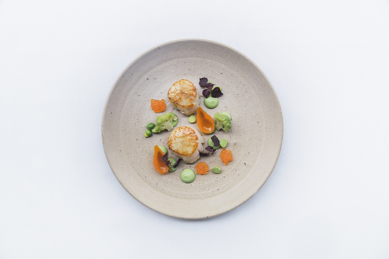 Pan-seared Hokkaido scallops, seasonal green pea cream, raspberry pearl onions, trout roe $34