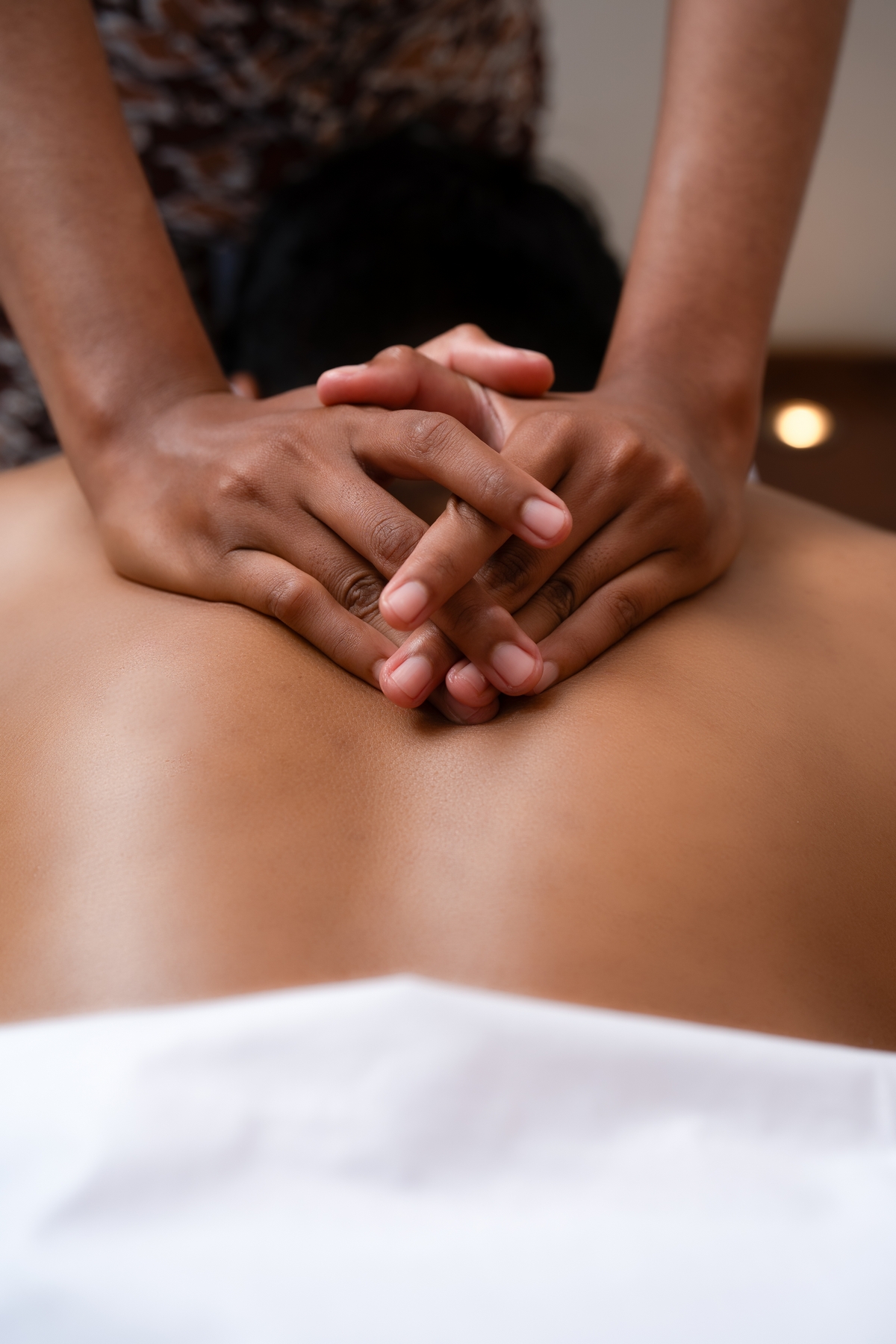 As the massage progresses, the therapist begins to apply deeper pressure through the palms and forearms. Muscles that may have tightened from travel, long workdays, or hours spent sitting gradually release. The movements remain fluid and rhythmic, never abrupt, each stroke flowing seamlessly into the next.