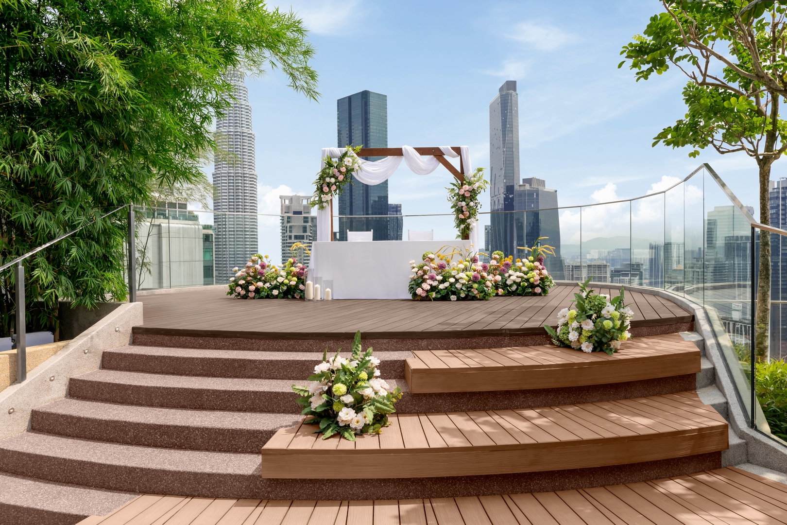 Later, ascend to the rooftop garden. The breeze carries faint city scents; the Petronas Twin Towers sparkle, reflecting off the distant fountains. A cocktail in hand, the rhythmic pulse of the KLCC Lake Symphony below, the city’s hum in the background—every sense feels alive. Imagine vows exchanged here, the towers framing the sky, an unforgettable setting for weddings or celebrations.