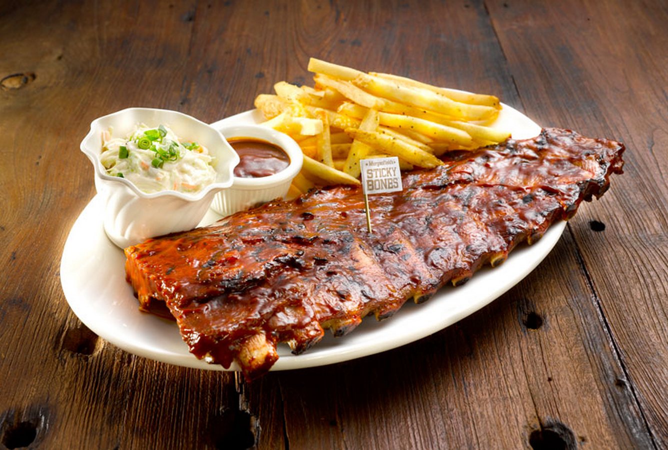 “粘粘排骨之家”的招牌排骨有一條排骨或半條排骨兩種分量可選,以及四種不同風味,其中包括了胡桃木燒烤醬以及大蒜燒烤醬味。