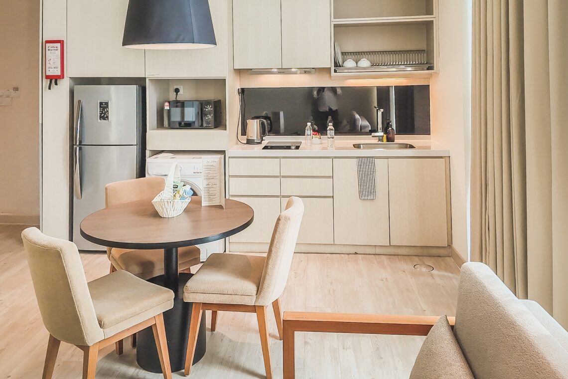 The one-bedroom suites at Oasia epitomise meticulous attention to detail and a sense of thoughtful completeness. The living area features a three-person couch, a coffee table, and a round dining table seating four, while a fully equipped kitchenette offers a refrigerator, microwave, washer with complimentary detergent, kettle, and premium cooking utensils.