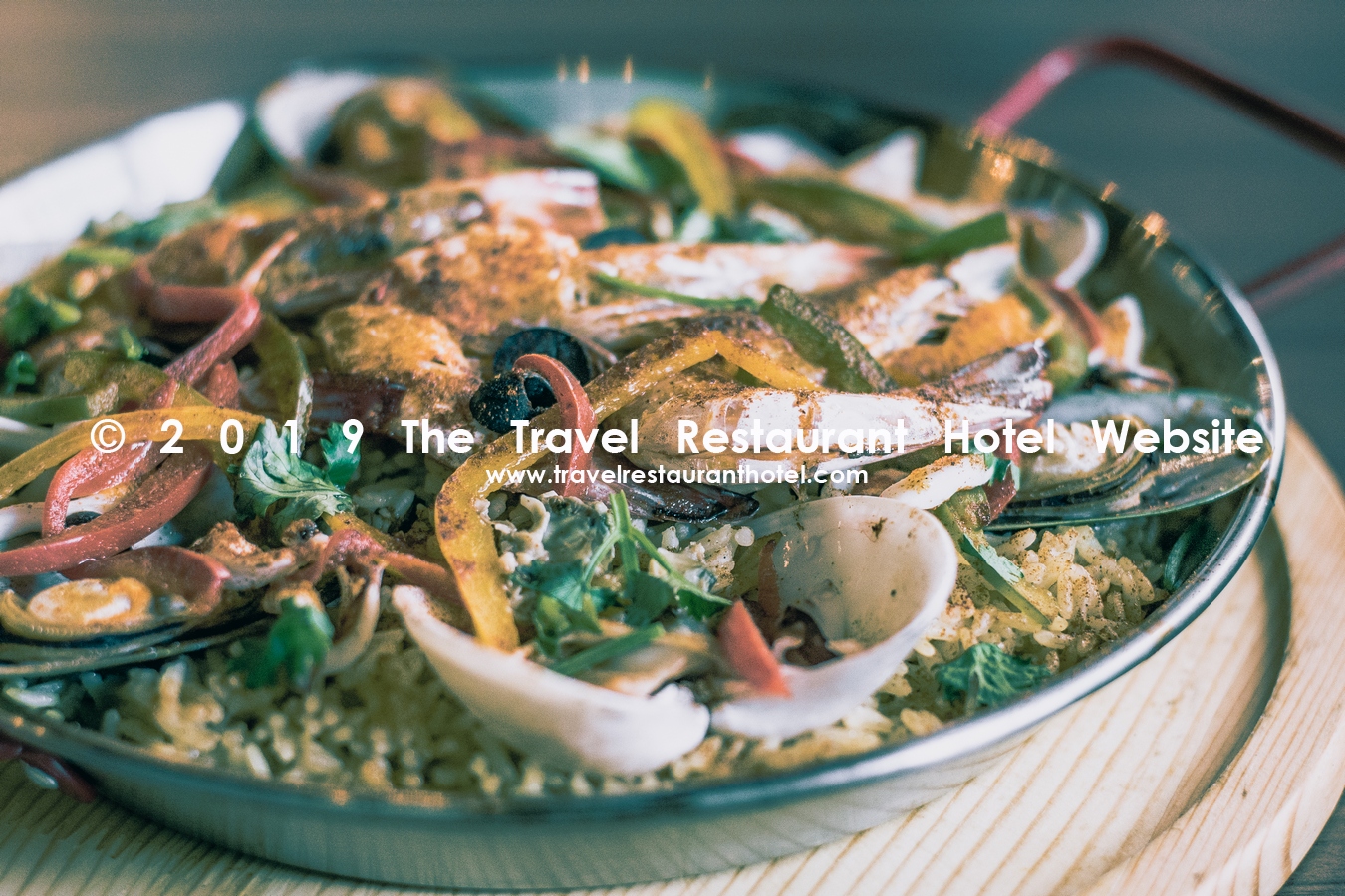 Traditional seafood paella with fresh prawn, clams, squid, tomato, pimento, green pepper, hot paprika and white wine.