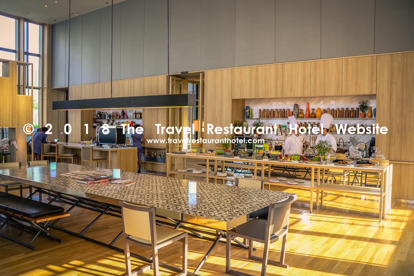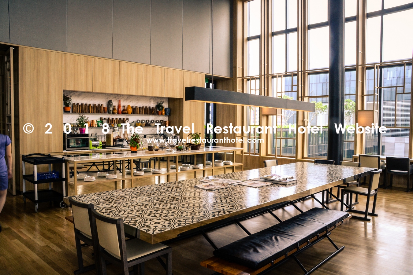 The lounge on the 16th floor is not especially luxurious, but I like it. It has a high ceiling, floor-to-ceiling glass panes on three sides of the lounge which overlooks the city and the small park in front of the hotel. The design of the lounge is a mixture of a lounge, a kitchen and a library. There is a huge (communal) table (just as in a kitchen) and also quieter, smaller tables and corners.