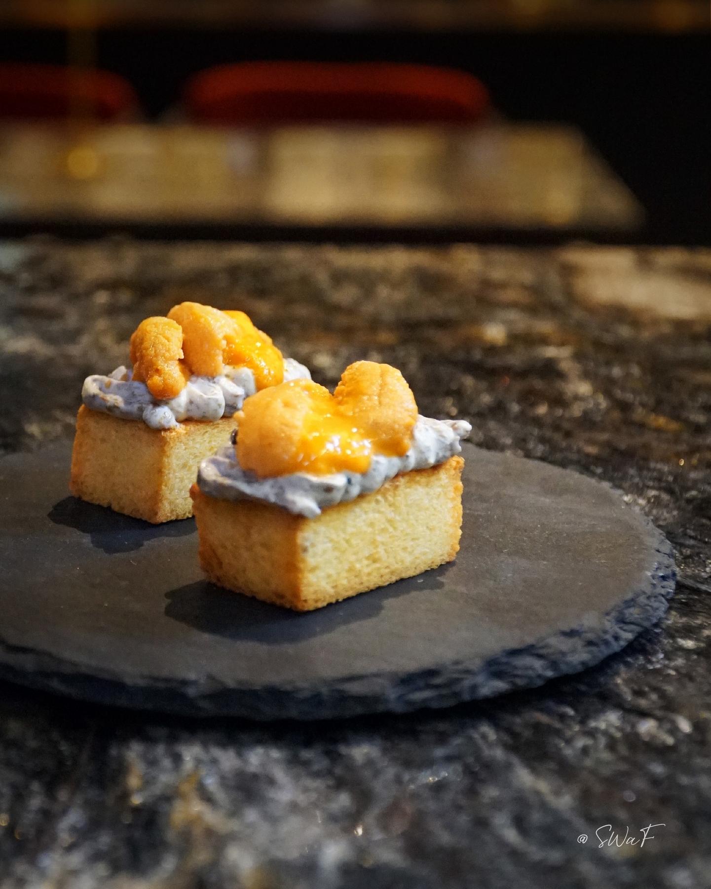 The Uni Toast is SWaF’s quiet showstopper—luxurious without ostentation. Generous Hokkaido sea urchin is laid atop toasted brioche, its natural sweetness amplified by the bread’s buttery richness. Beneath it lies a house-made cheese spread, lending subtle tang and depth without distracting from the uni’s oceanic purity.