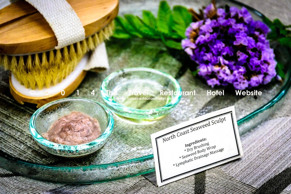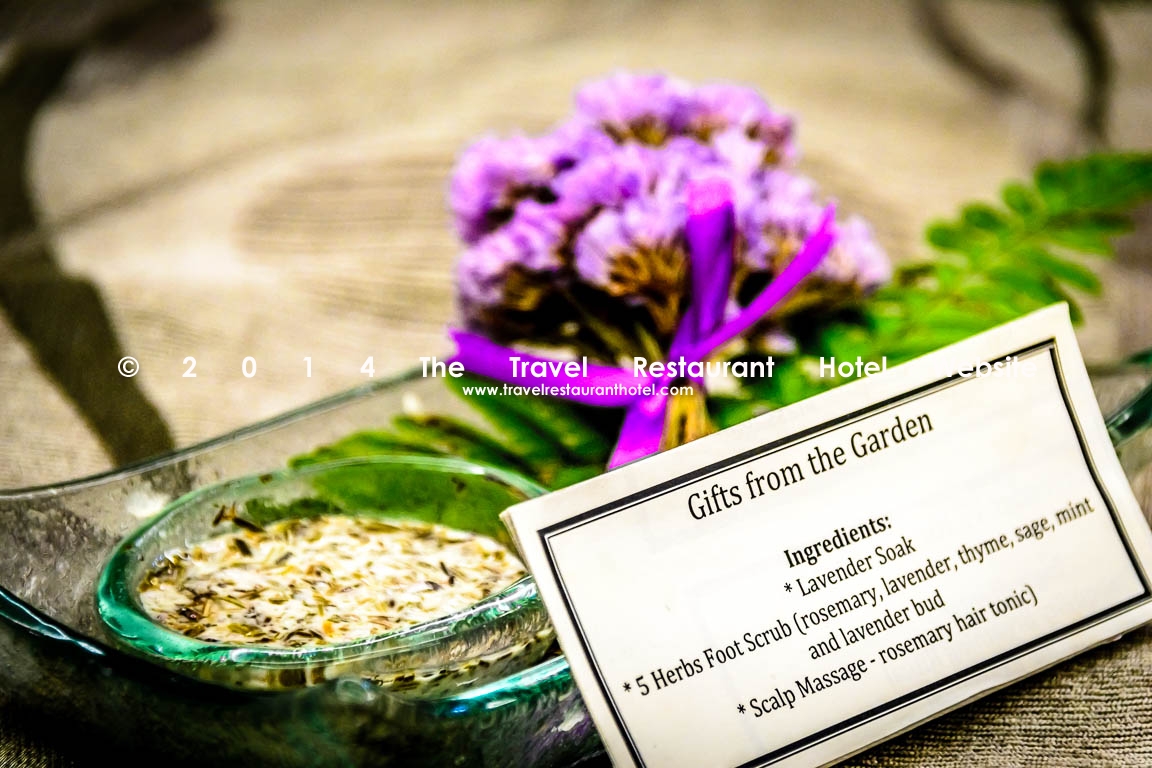 First, I was brought up to the balcony overlooking the pool. There were a row of lounge chairs, each with a beautiful, porcelain Victorian footbath. My therapist poured warm lavender water from an equally ornate porcelain Victorian jug into my footbath. I soaked my feet into the water. It felt so good! My very tight calf muscles, as well as the rest of my body, relaxed. My therapist then proceeded to scrub off all the dead skin on my feet with a 5-herb foot scrub: rosemary, sage, thyme, mint and lavender. It felt so good to have my tired feet scrubbed and invigorated. Finally, after rinsing off the scrub, she gently took my feet and dried them with a very soft and thick towel. My feet were fresh, sanitized and new.
