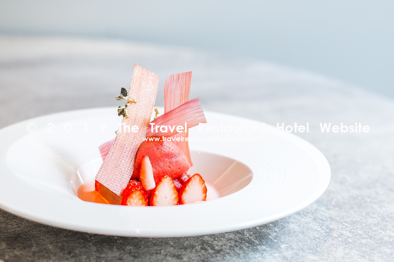 Marinated Gariguette strawberries, rhubarb lightly confit, vanilla chantilly, strawberry and rose sorbet