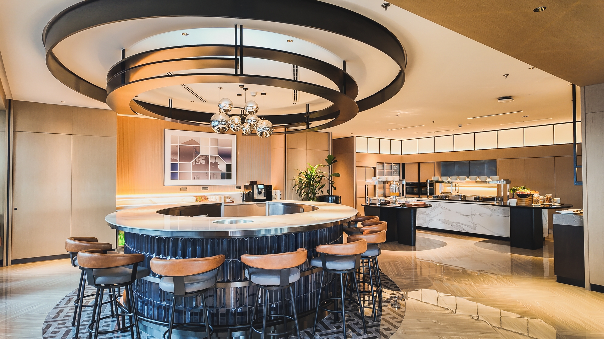 酒店其他区域,纹理丰富的瓷砖和温暖的木质装饰延续了触感与工艺的精髓。行政酒廊和&More by Sheraton的吧台下方设有挂钩,方便悬挂外套和包袋,这些看似不起眼却贴心的细节,体现了酒店对宾客便利的细致考量,确保即使是最实用的方面也尽显匠心、精致与奢华。