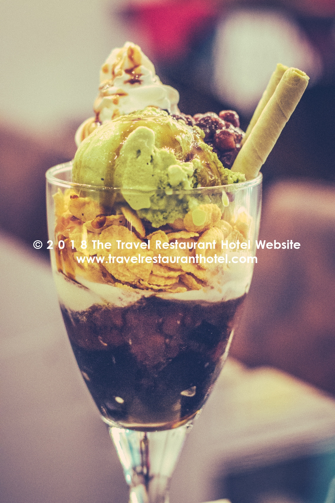 An Asian parfait. The bottom layer is grass jelly. There is matchaice cream, corn flakes, mochi on top.