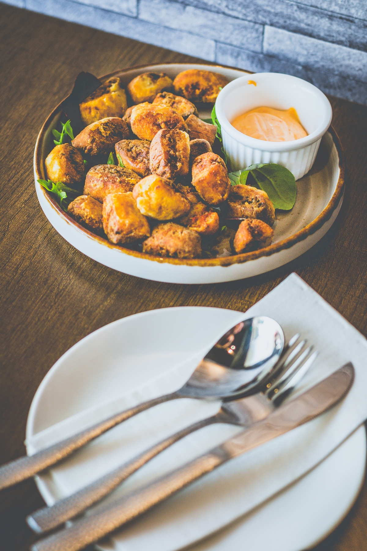 Deep fried gnocchi stuffed with spicy beef, ricotta cheese with Sriracha mayo sauce