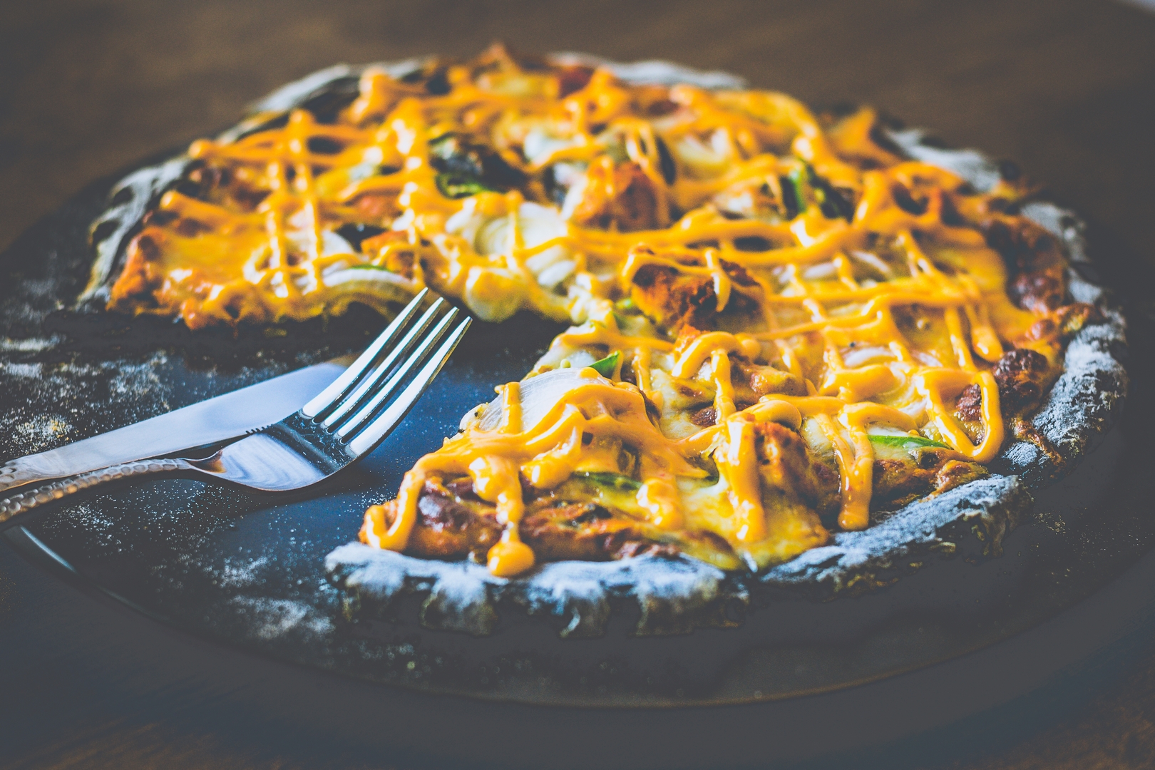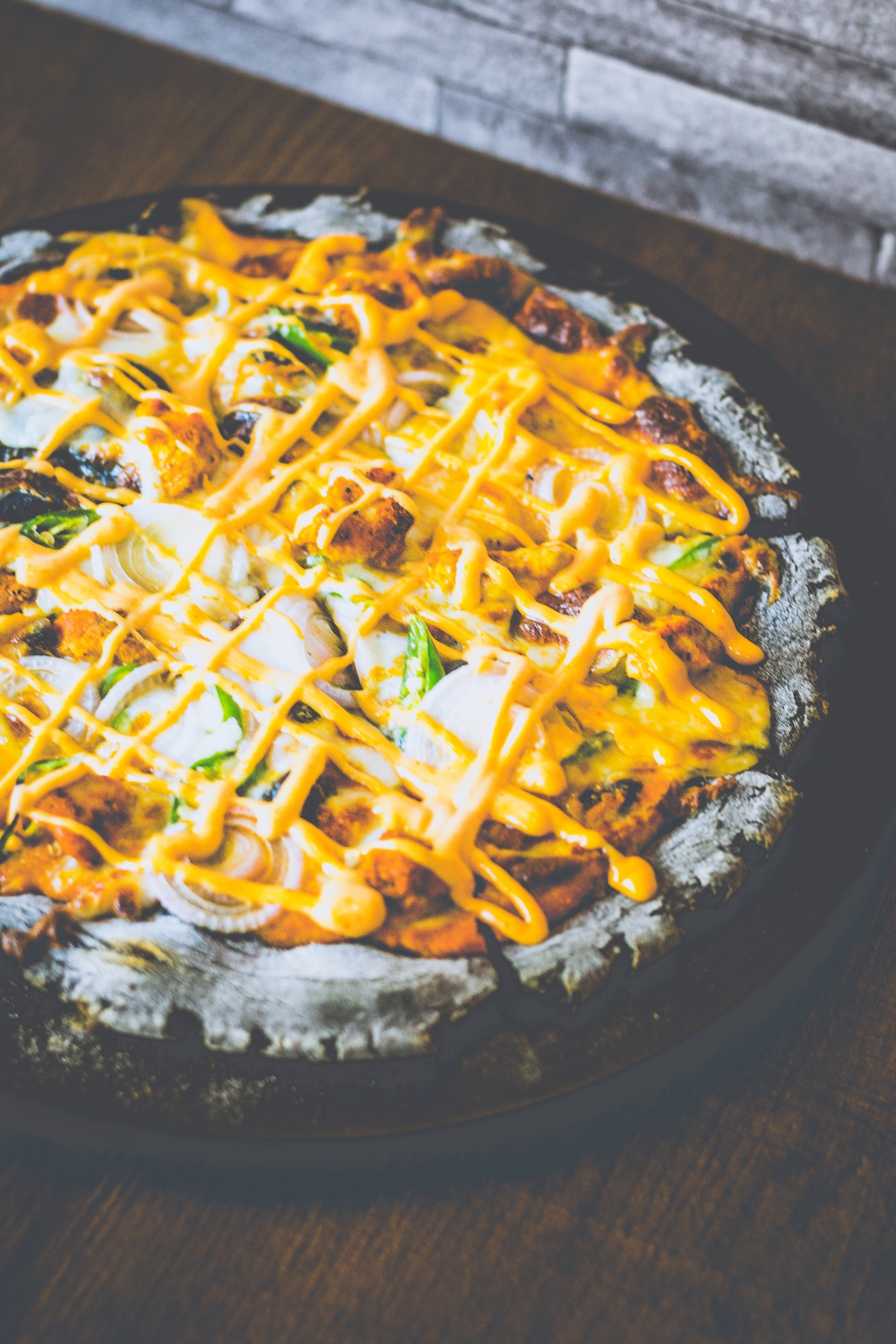 Charcoal base, roasted pepper sauce, mozzarella, tandoori chicken, red onion, jalapeno, spicy mayo