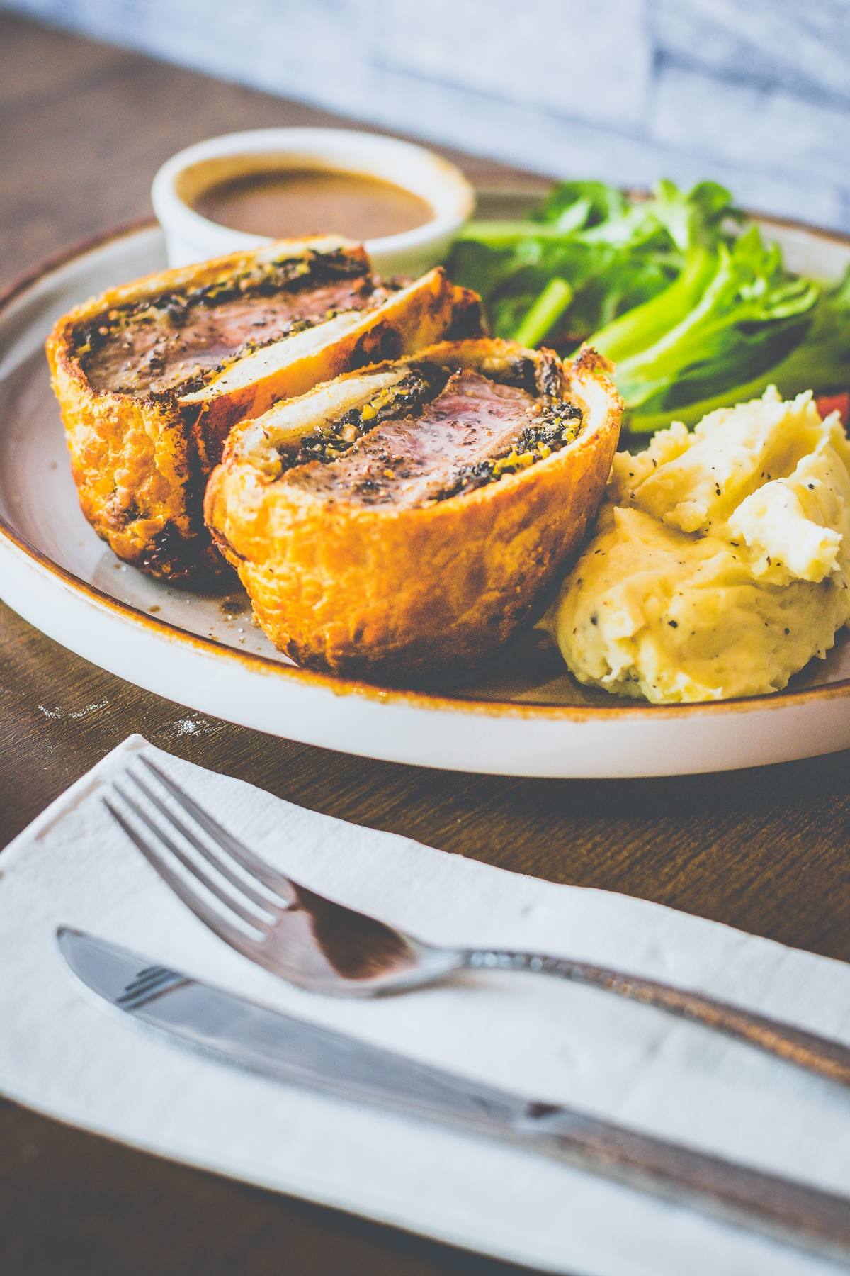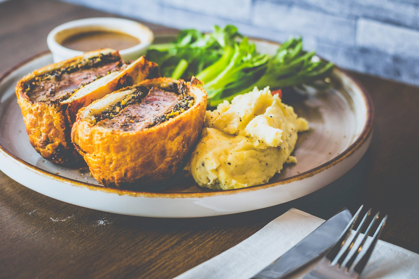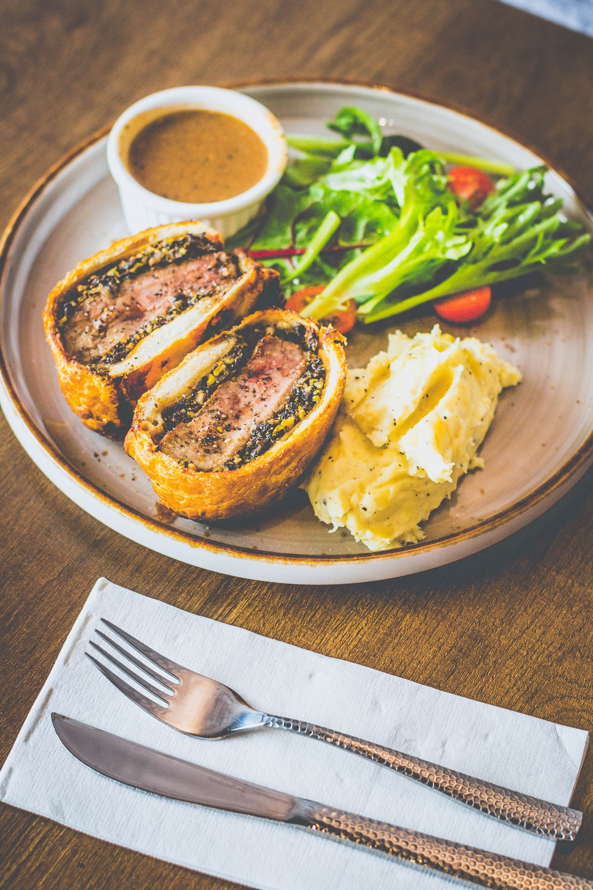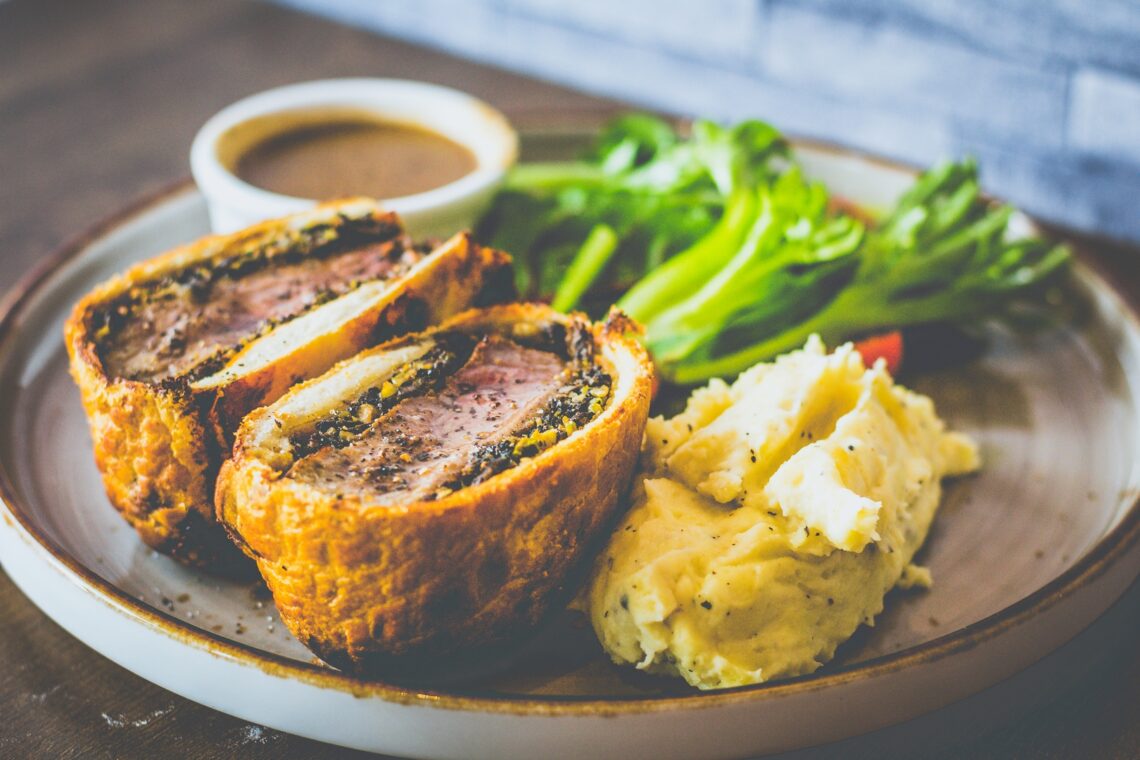 Beef tenderloin topped with onion, mushroom, herbs, wrapped in turkey ham and wrapped in buttery puff pastry