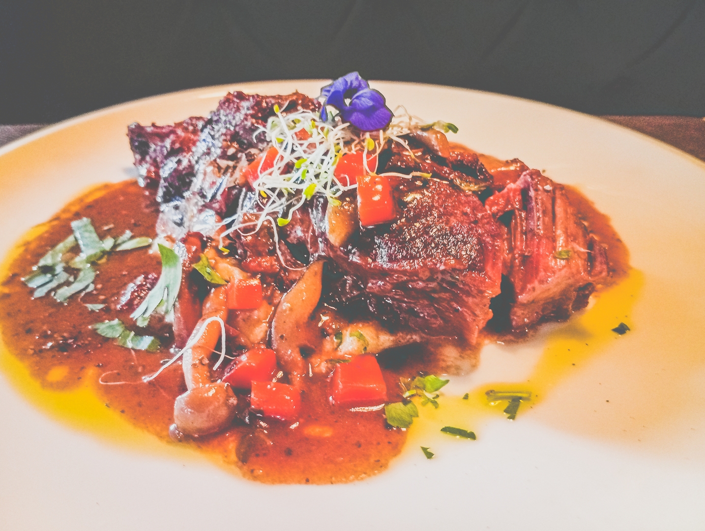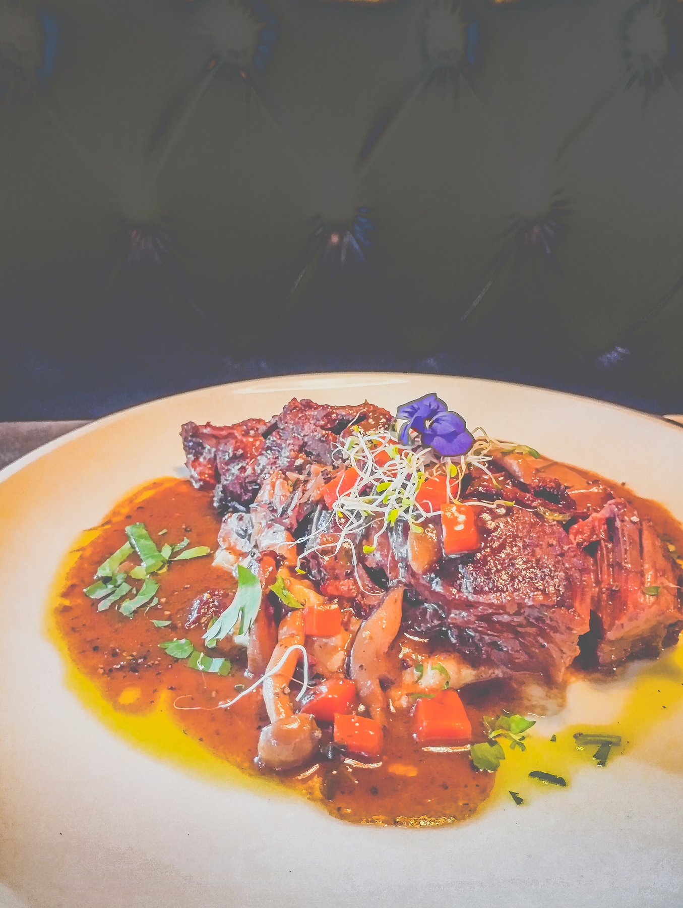 The first incision requires no effort. The blade slips through with the ease of silk on marble. On the palate, it dissolves—succulent, buttery, and hauntingly tender. The flavour profile is a sonata in depth: aged beef, marrow, root vegetables, and red wine reduction, all converging into a concentrated savouriness that is almost sacred. There is an elusive note—perhaps cacao nib or espresso—that gives a final, slightly bitter counterpoint to the otherwise luscious richness.