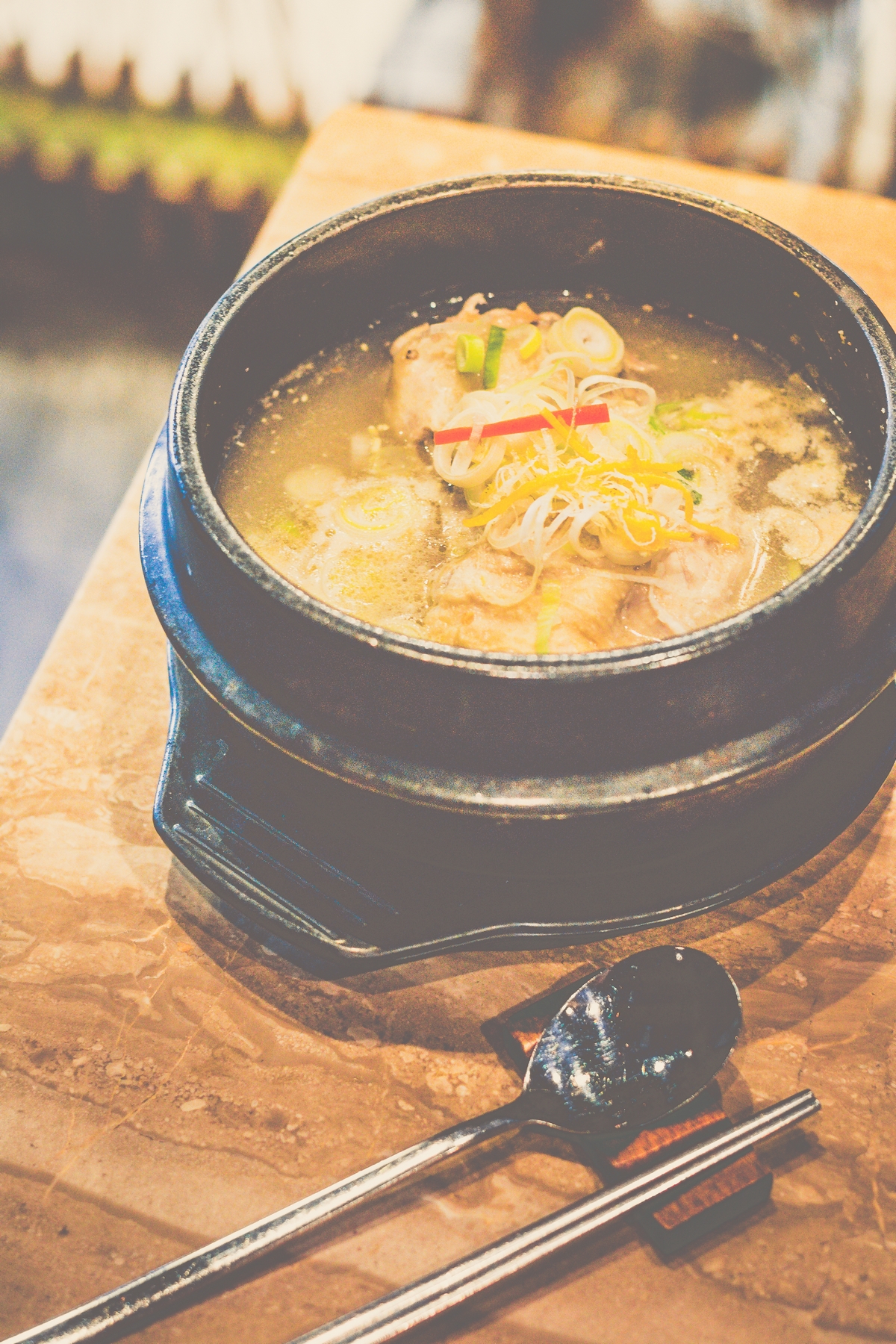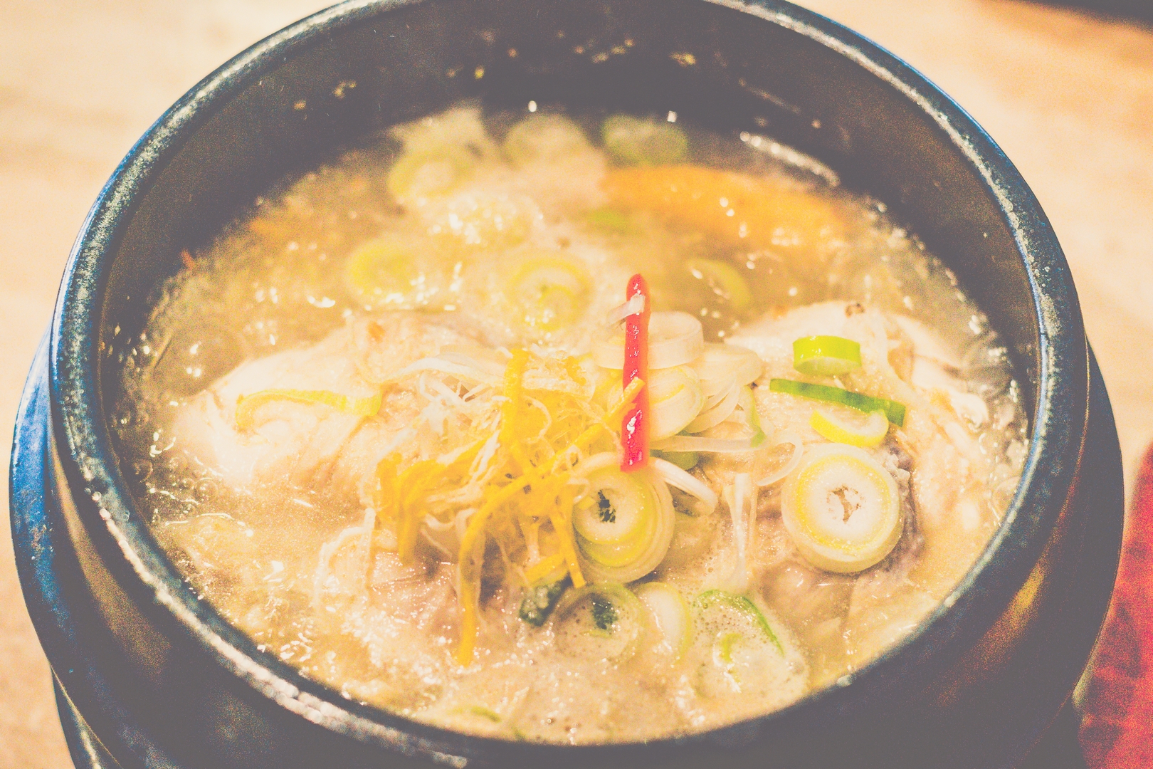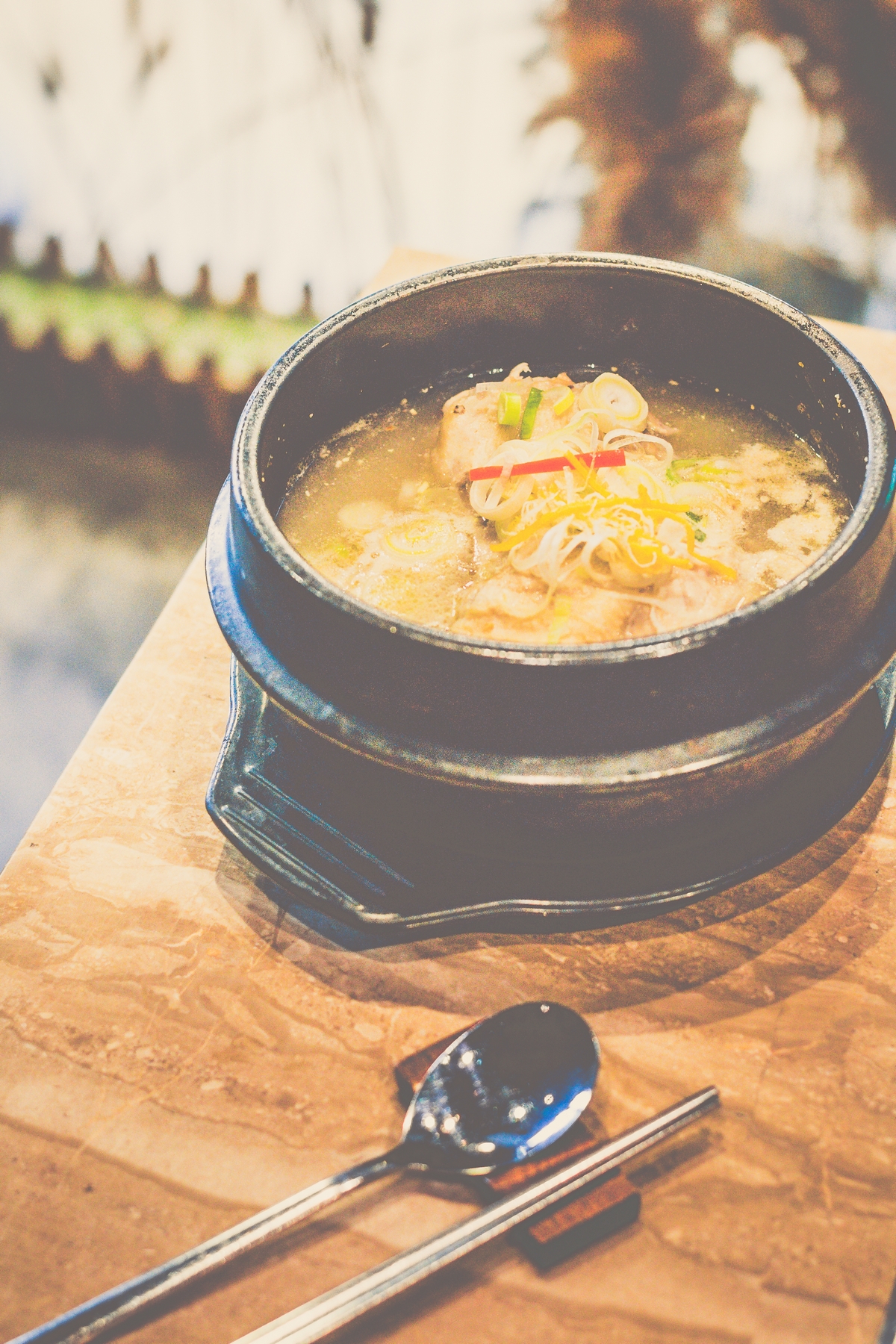 Presented in a weighty black stone vessel, the soup arrives gently steaming, perfumed with whispers of ginseng, garlic, jujube, and rice. There is a purity to the presentation—a whole young chicken, bone-in, nestled in golden broth, undisturbed by garnish or ornamentation. One is drawn in by its simplicity, which is not plainness, but poise.