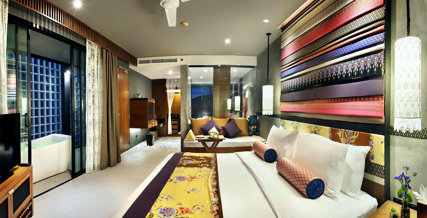我入住了度假屋頂層的豪華海景房。這間舒適的客房面積約為34平方米,非常適合與伴侶和小家庭入住。在房間裡,我目睹了彩色鮮豔的布料裝飾,同時在床上擺不同顏色的亞麻布,並配搭了Nook Dee的穿著泰式服飾的標誌大象毛絨擺放著枕頭中間。房間的氛圍描繪了泰式樸素的概念,從每個房間的入口處就能看到中式普吉島的獨特明亮木製面板。