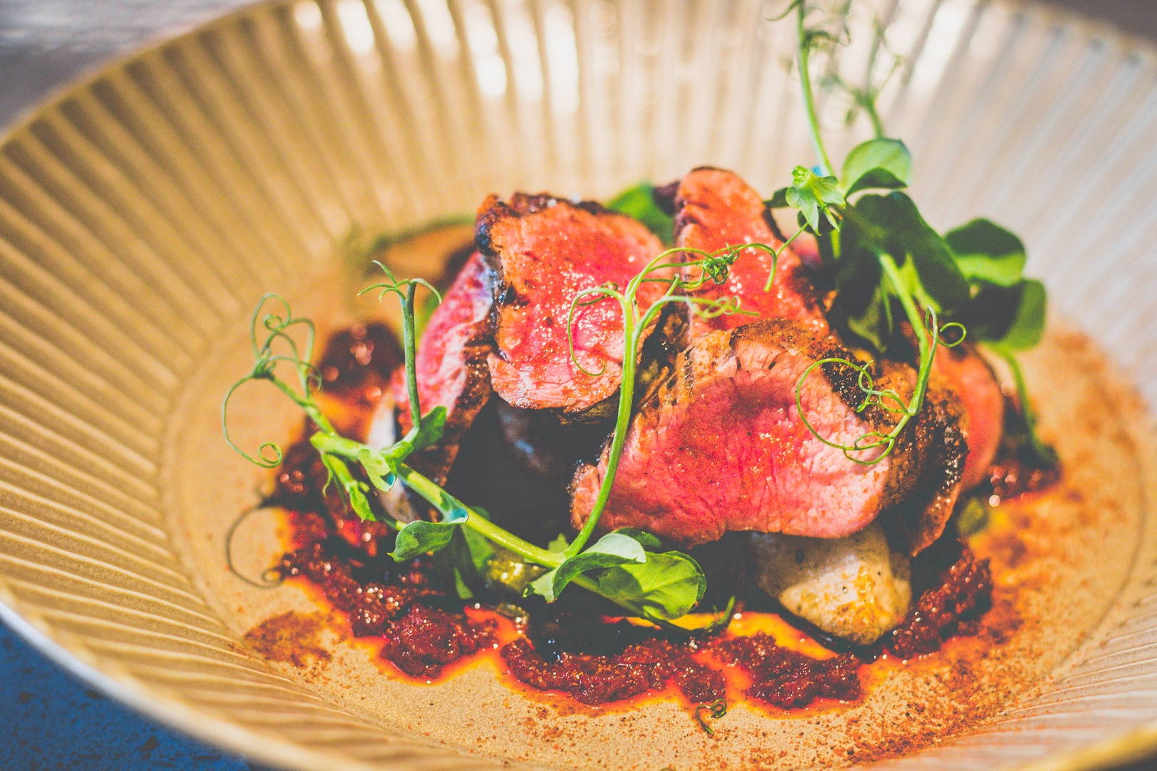 The accompaniments speak to global influence. A purée of spring onion lends freshness and sweetness; anchovy introduces a saline intensity that deepens the lamb’s flavour without overpowering it. Then comes the Kanzuri chilli oil — a Japanese condiment of fermented yuzu and red pepper — providing warmth, acidity, and a slow-building heat that enlivens each bite.