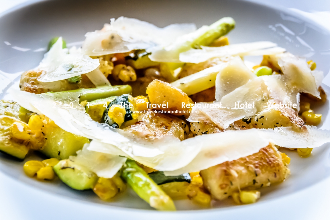 Pan-fried Gnocchi, Corn, Asparagus, Zuchini, Parmesan, Thyme, Truffle and Verjuice dressing. (Vegetarian) IDR120,000 for entree or IDR180,000 for main course