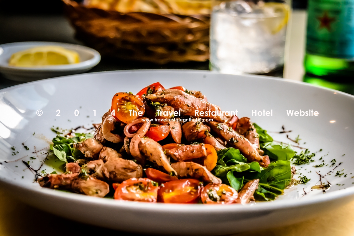 Using light, fresh ingredients and flavours, this is a great meeting of the sea and garden. Generous quantity of octopus is first boiled and then left to cool to a lukewarm temperature. The seafood is transferred to a bed of rucola and halved cherry tomatoes dressed with balsamic vinegar and a dash of olive oil. Refreshing! The satiating octopus has been cleverly balanced out by the raw vegetables and the balsamic vinegar.