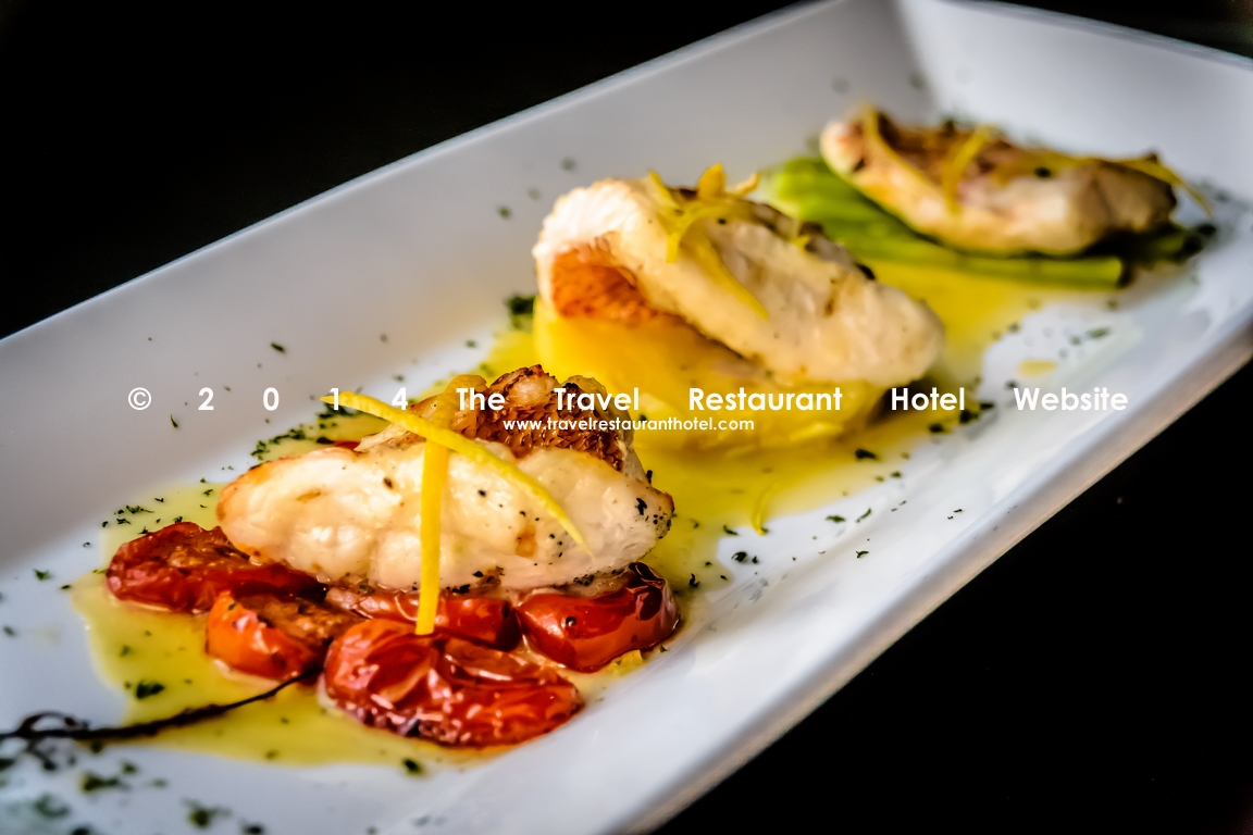 This is a Sardinian dish. Served on cherry tomatoes, boiled potato and asparagus, the baked red snapper fillets have the colours of the Italian flag- red, white and green as its base. The flavour comes from a buttery lemon sauce. The sauce is a small adaptation for Asian market. In Europe and America, they prefer fish to be dry.